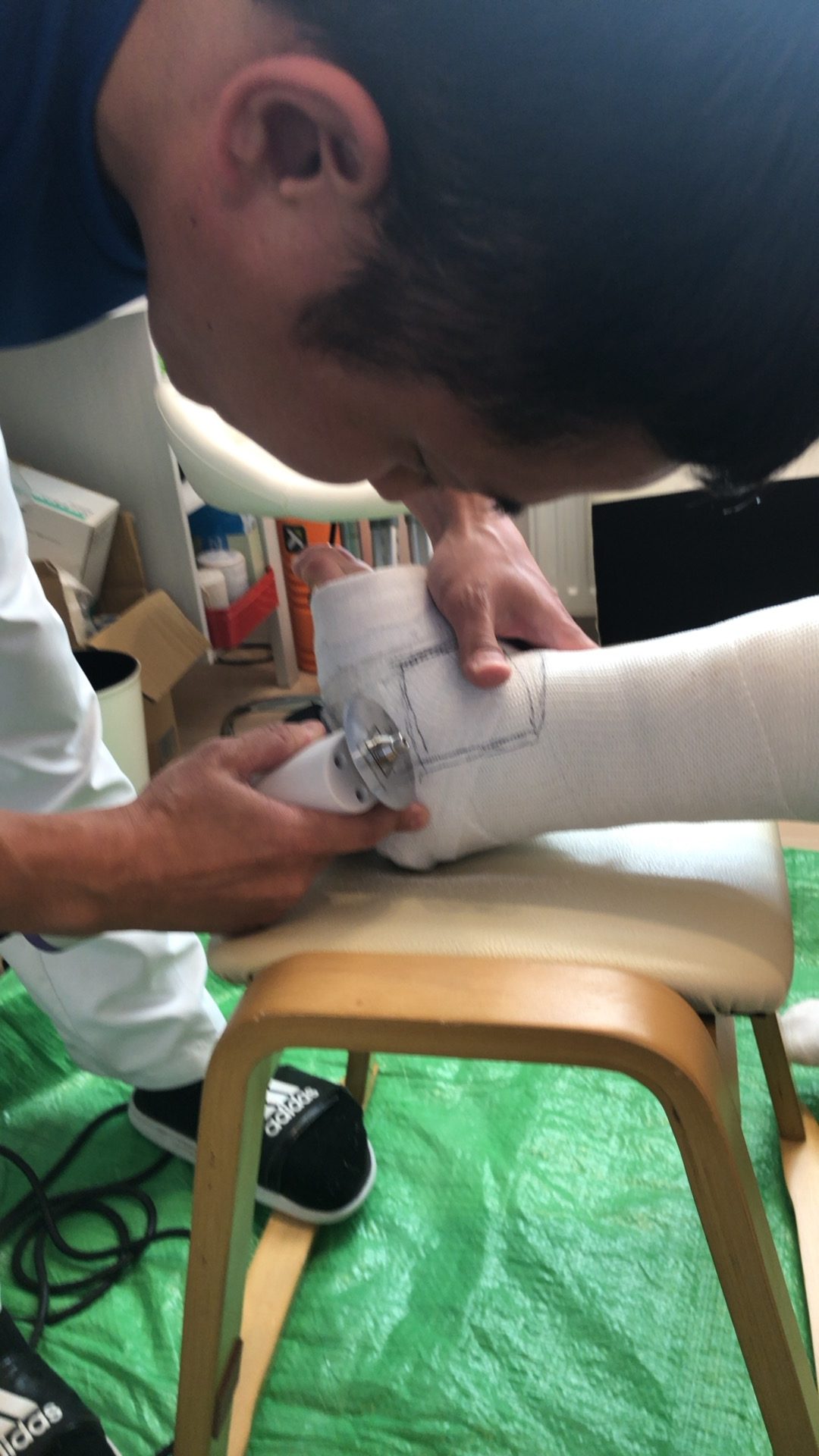 前回ギプス固定をした選手ですが、今回の来院時にギプスカッターを使ってケガをしている部分に窓を開けました!!