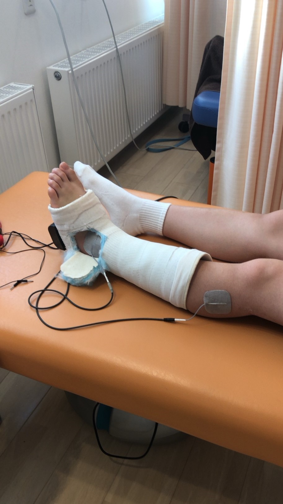 ギプスを使用することで完全に安静を保ち、ヒール付きのギプスなので痛くない範囲で足を着く刺激が治りを早めてくれます。